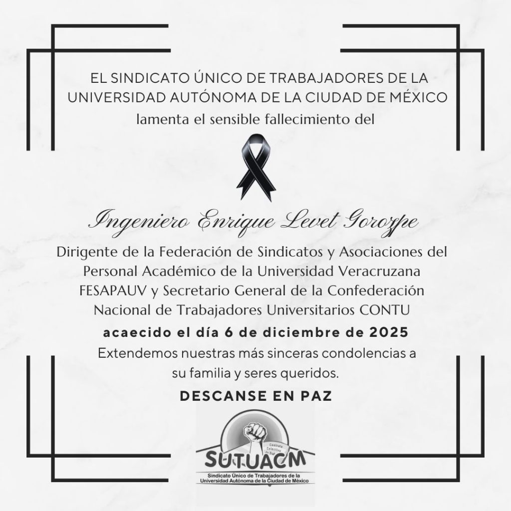 El SUTUACM lamenta el sensible fallecimiento del Ingeniero Enrique Levet Gorozpe Dirigente de la FESAPAUV y Secretario General de la CONTU