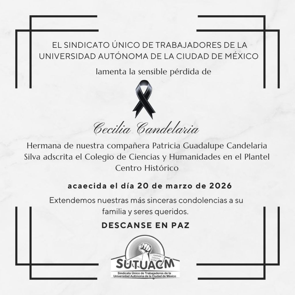 El SUTUACM lamenta el sensible fallecimiento de Cecilia Candelaria hermana de nuestra compañera Patricia Guadalupe Candelaria Silva