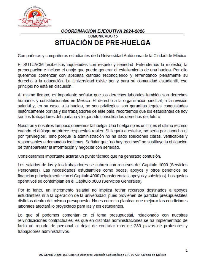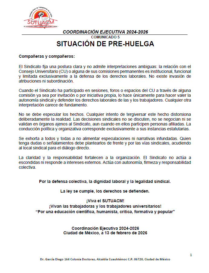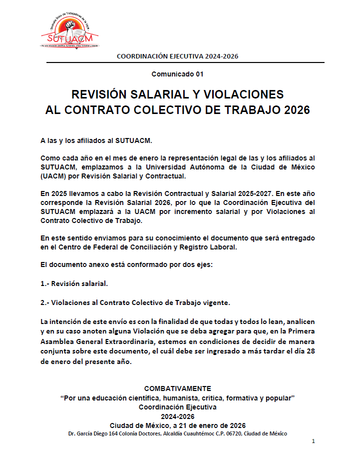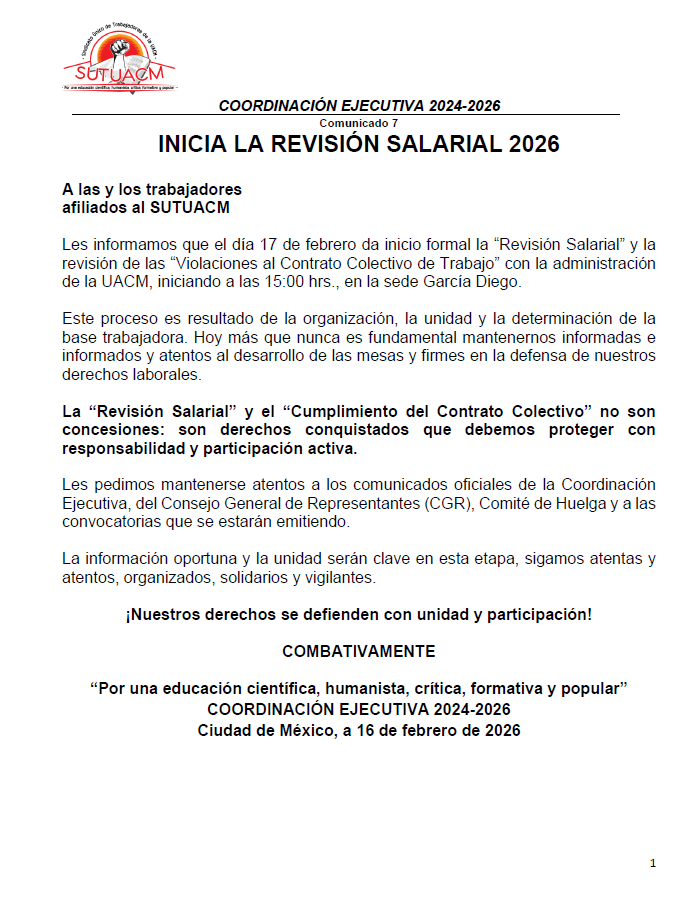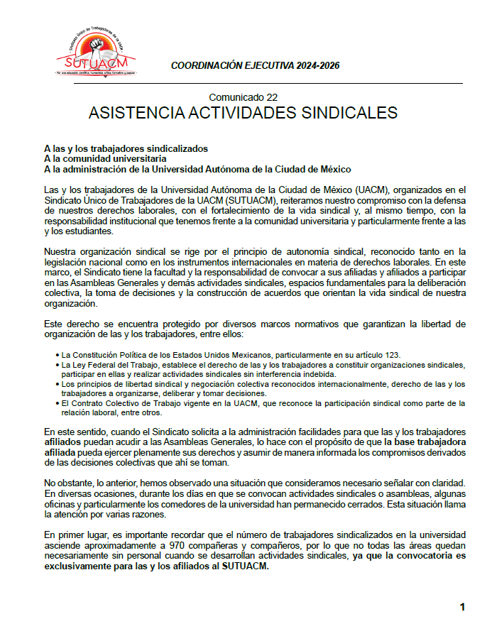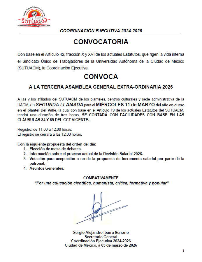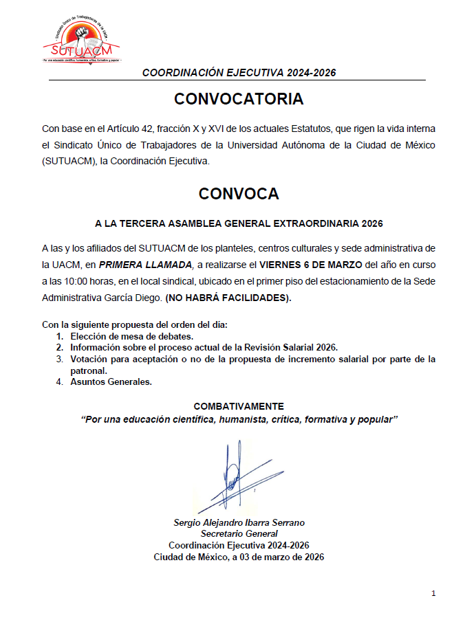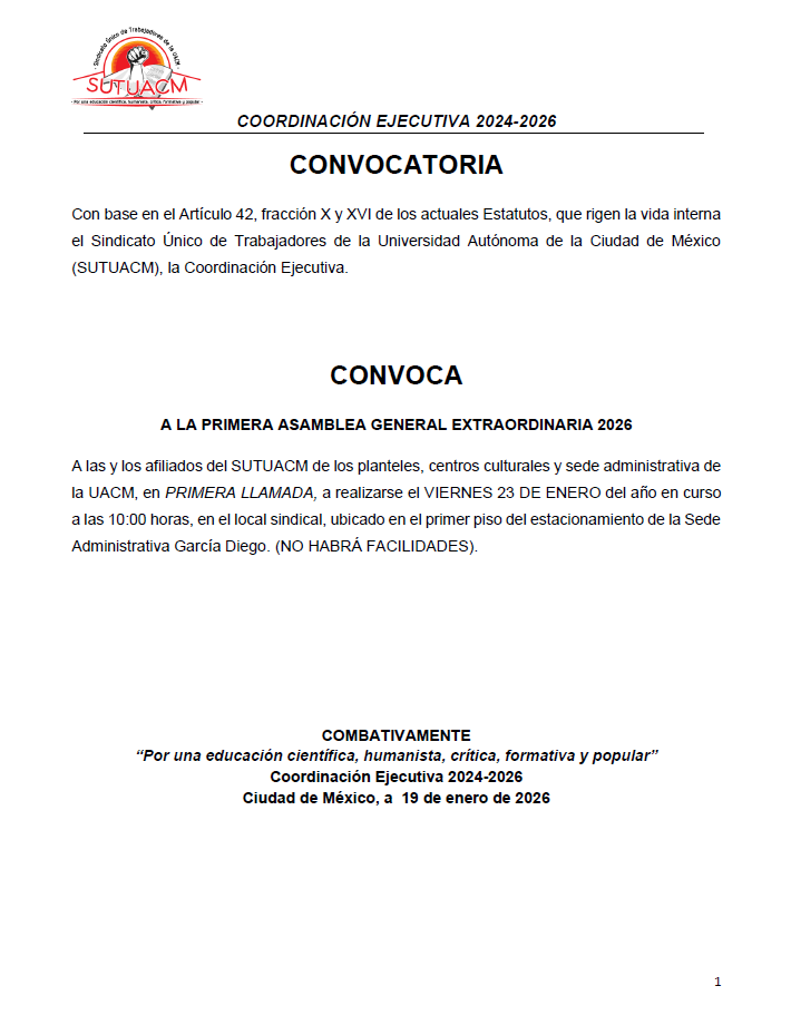 La Coordinación Ejecutiva del SUTUACM convoca a las y los afiliados de los planteles, centros...
