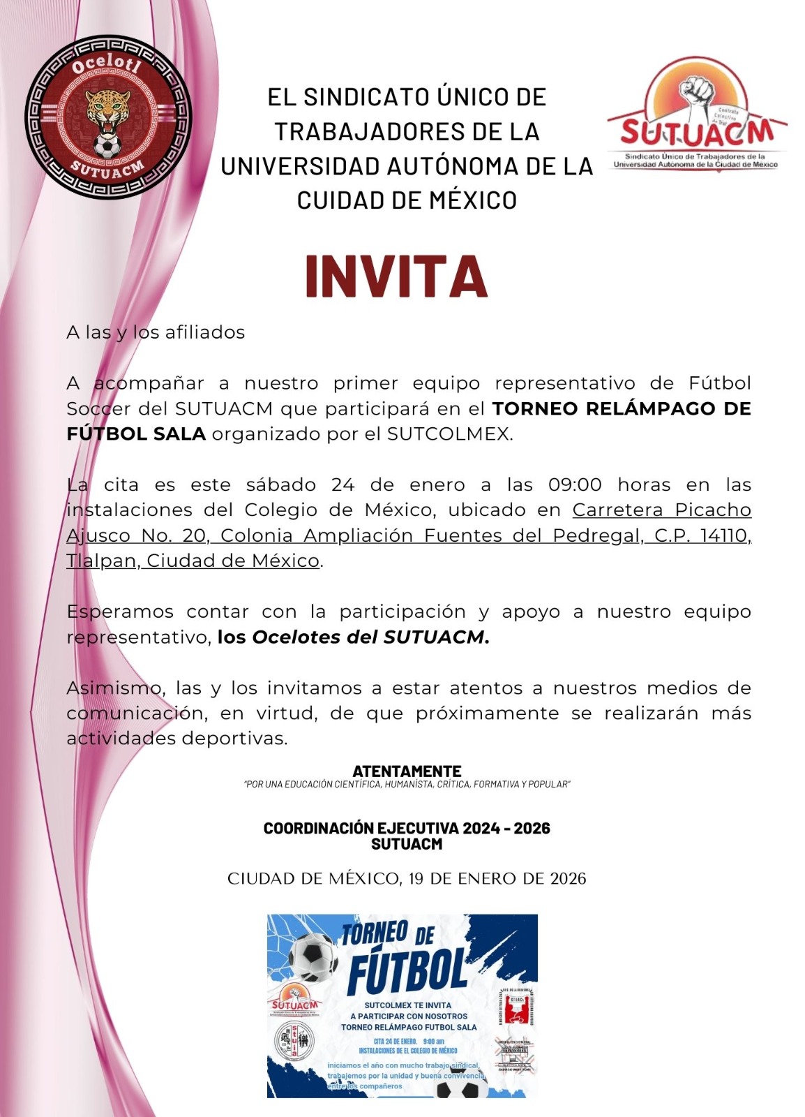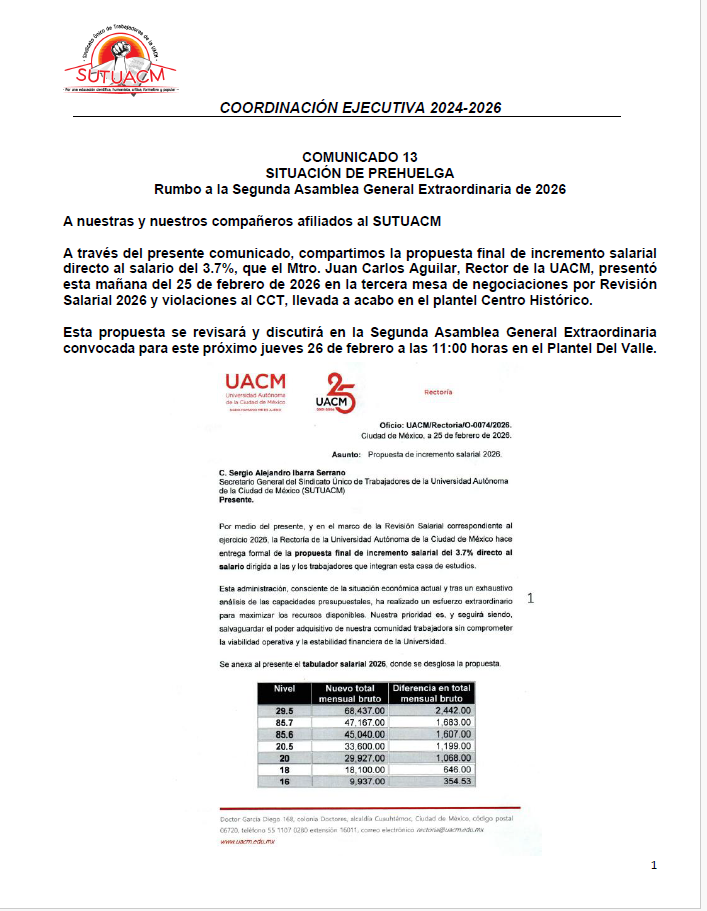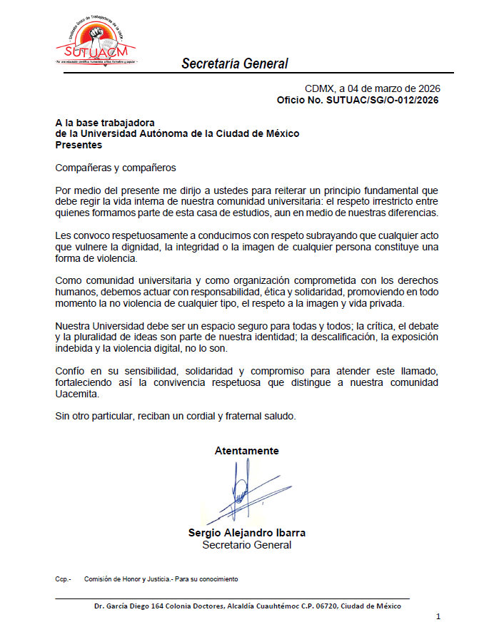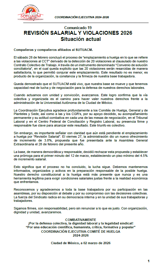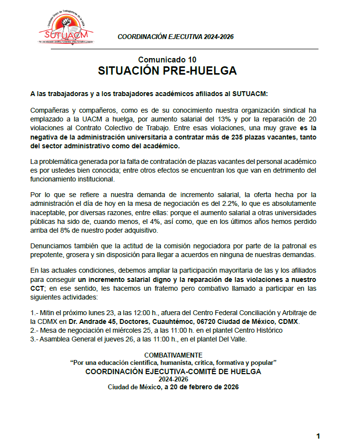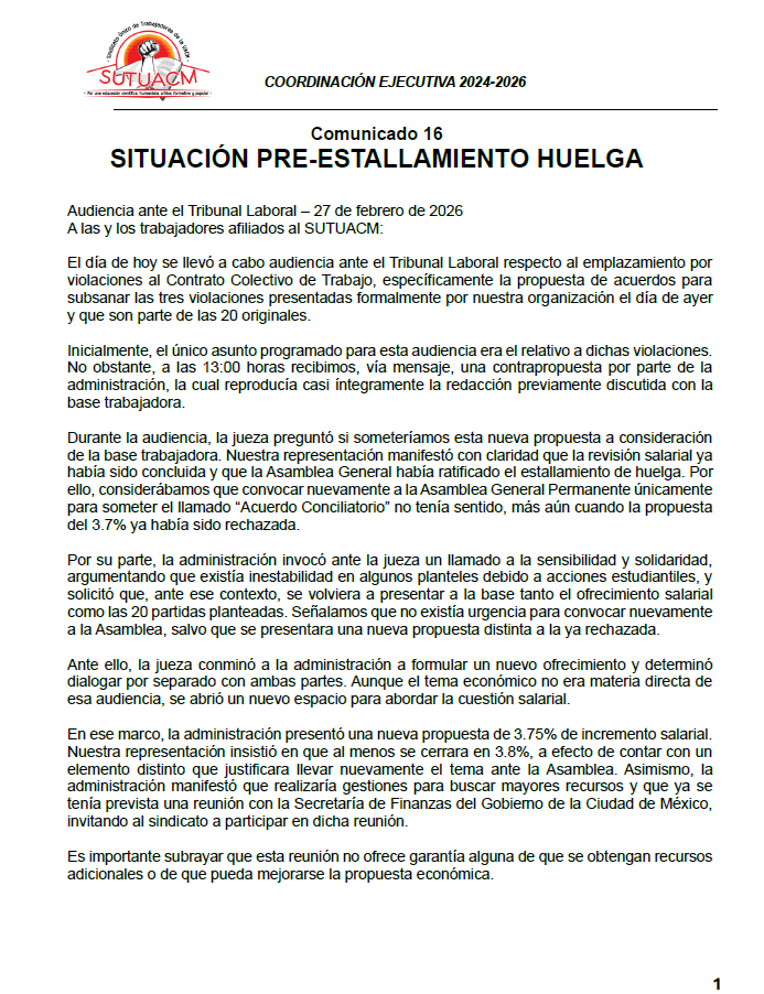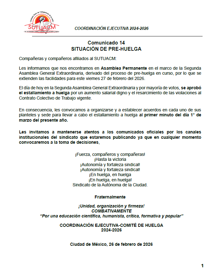 La Coordinación Ejecutiva del SUTUACM convoca a las y los afiliados de los planteles, centros...