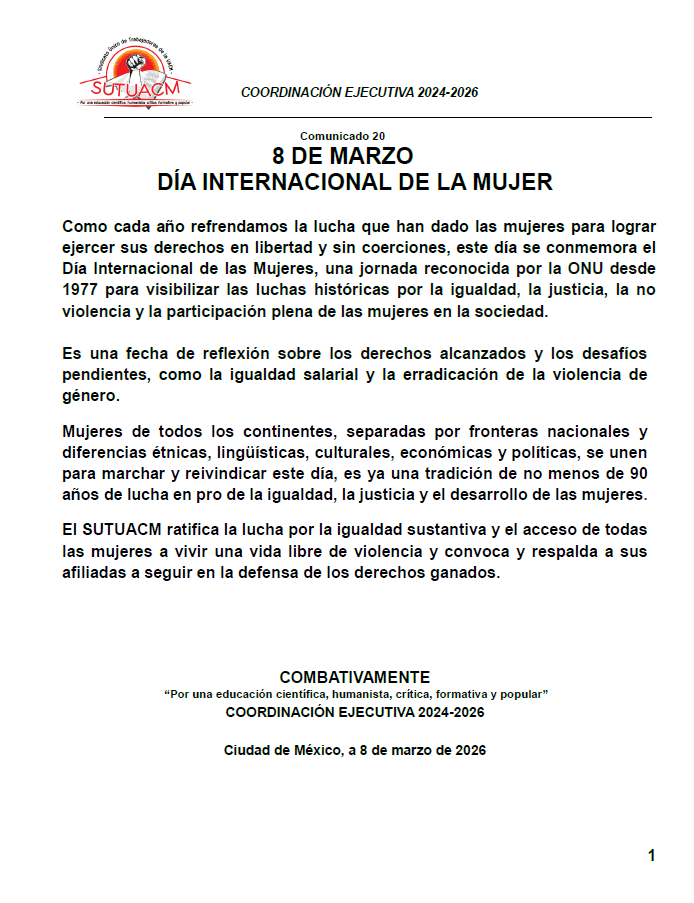 Comunicado 20 8 DE MARZO DÍA INTERNACIONAL DE LA MUJER