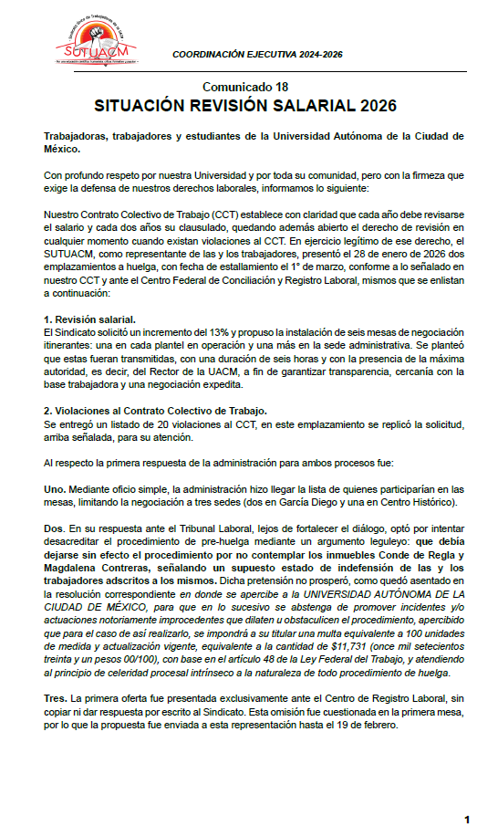 La Coordinación Ejecutiva del Sindicato Único de Trabajadores de la Universidad Autónoma de la...